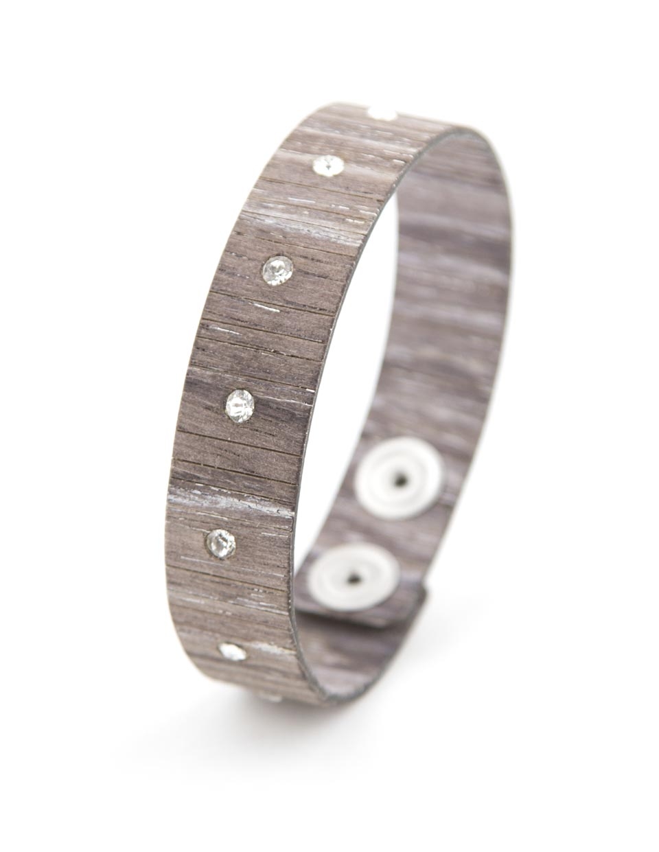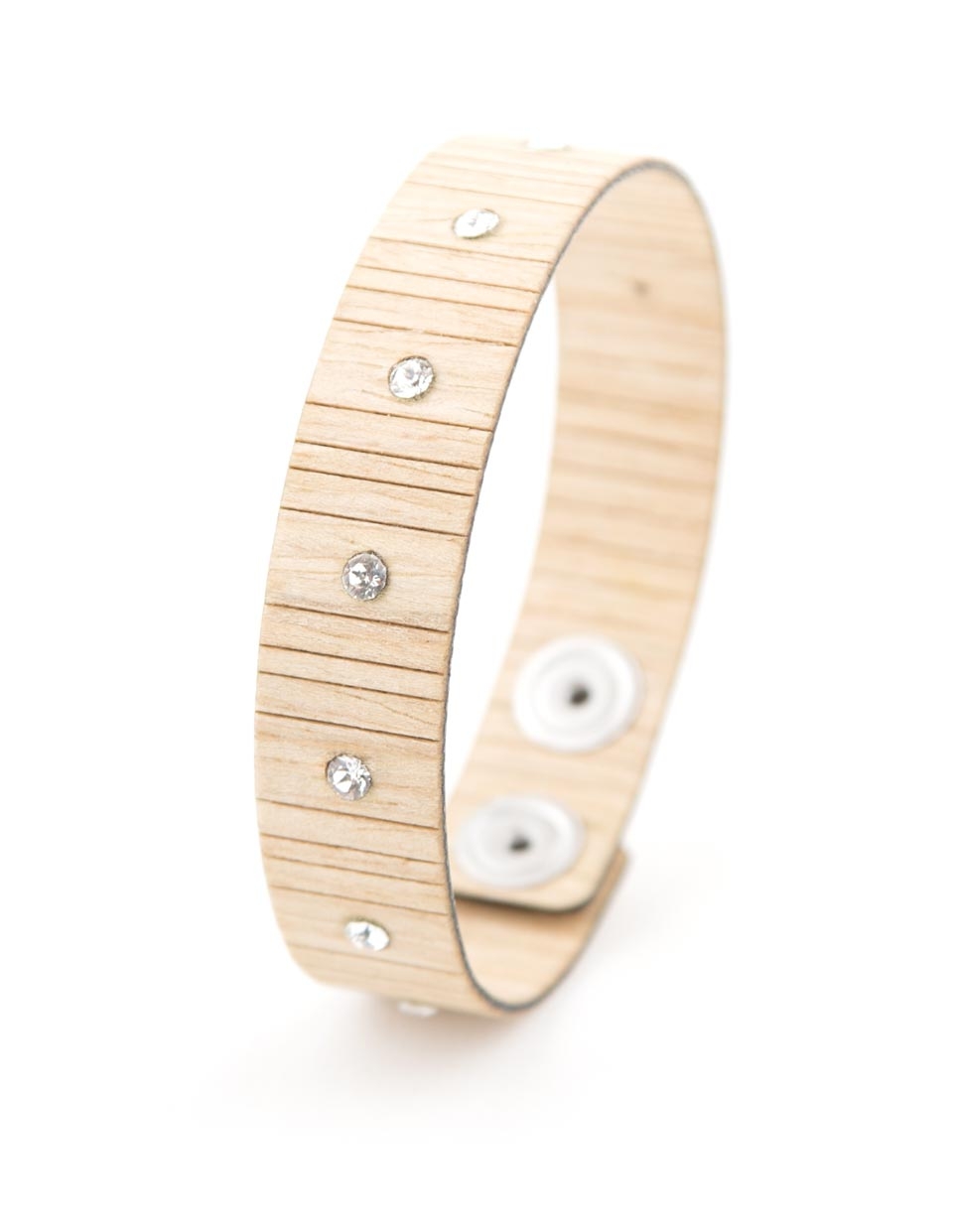 Wooden bracelet with a linear elegance, embellished with the sparkle of the Swarovski elements.